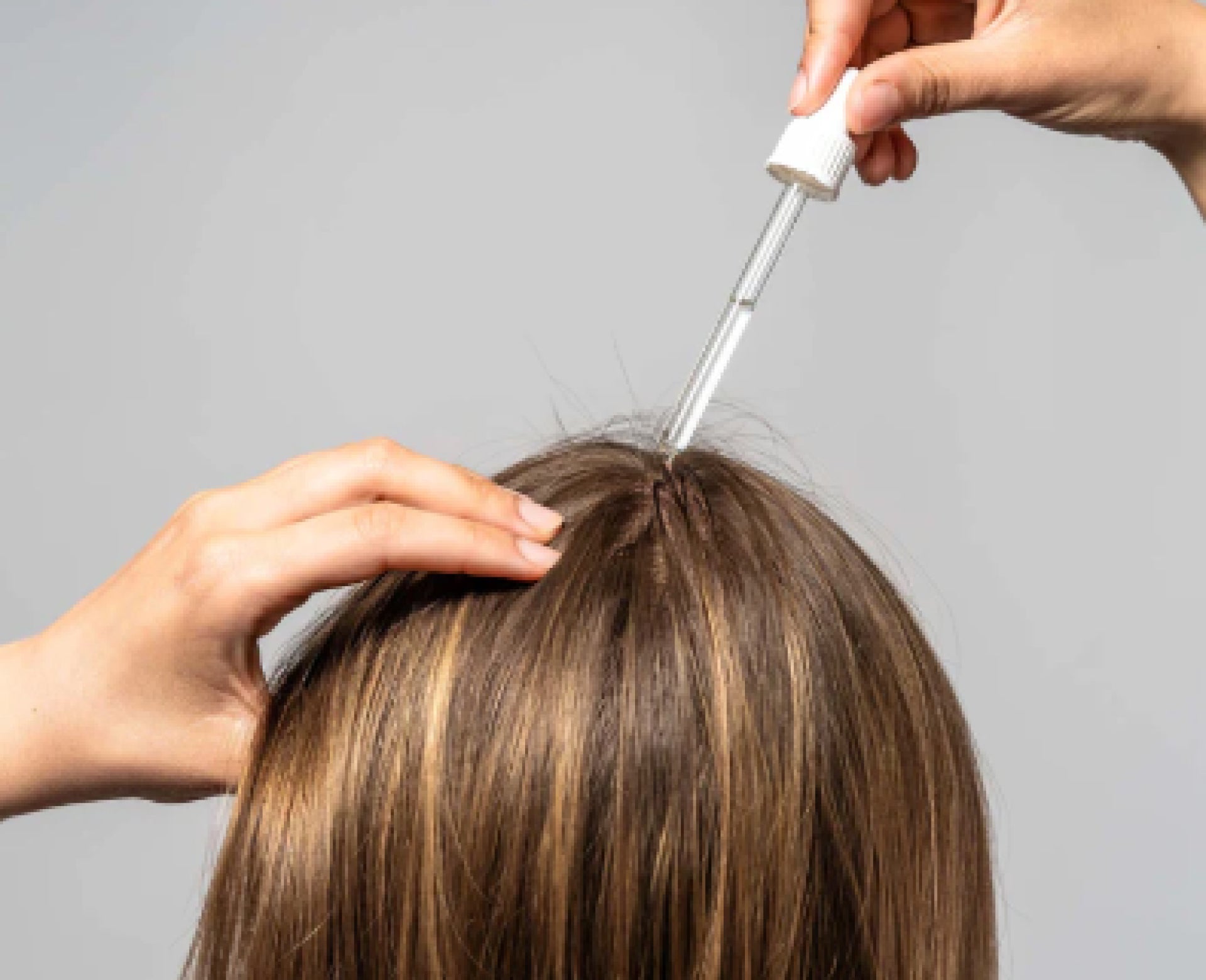 3. Plaats het uiteinde van de pipet op het deel van de hoofdhuid dat u wilt behandelen en knijp zachtjes in het pompje om de oplossing geleidelijk vrij te laten komen. Om te voorkomen dat de oplossing van de hoofdhuid afloopt, brengt u een kleine hoeveelheid per keer aan.